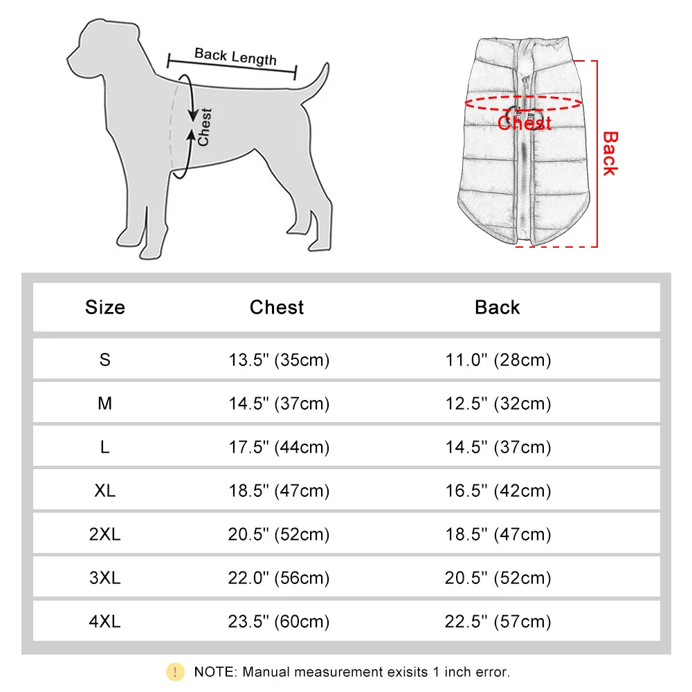 - XL: Chest 48-54 cm / 18.9-21.3 inches; Length 34 cm / 13.4 inches